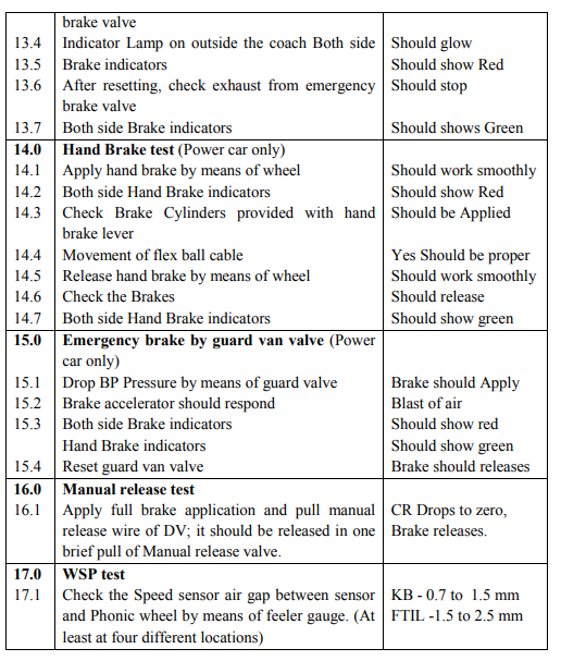 In both the power cars, check the condition & mounting of hand brake cables fitted on both the brake cylinders. Rotate the hand wheel fitted in guard van clockwise to apply the brakes, after full rotation brake should apply in both the brake cylinders & hand brake indicator should show red. Rotate the hand wheel anti clockwise, now brakes of both the cylinders should get release & hand brake indicator should show green.